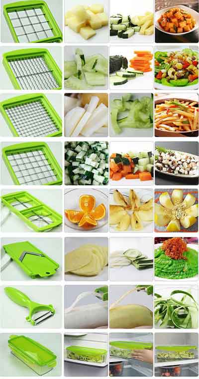 به کمک تیغه های بسیار تیز نایسر دایسر پلاس میتوانید خیار ، گوجه فرنگی و پیاز را برای ساخت سالاد فصل در قطعات کاملاً یک اندازه و یک دست خرد کرده ، سیب زمینی و کدو را برای سرخ کردن در زمان بسیار کوتاهی به حلقههای یک شکل و یک اندازه خرد کنید ، با پوست کن بسیار تیز آن پوست میوه ها را جدا کنید ، بدون آنکه نگران له شدن گوجه فرنگیهای رسیده باشید آنها را به 4 یا 8 قسمت کاملاً مساوی تقسیم کنید و یا بدون آنکه متوجه بوی تند پیاز شوید ، فقط با یکبار فشار دادن درب این خرد کن ، تمام پیازها را به قسمت های خرد شده بسیار ریز تقسیم کنید