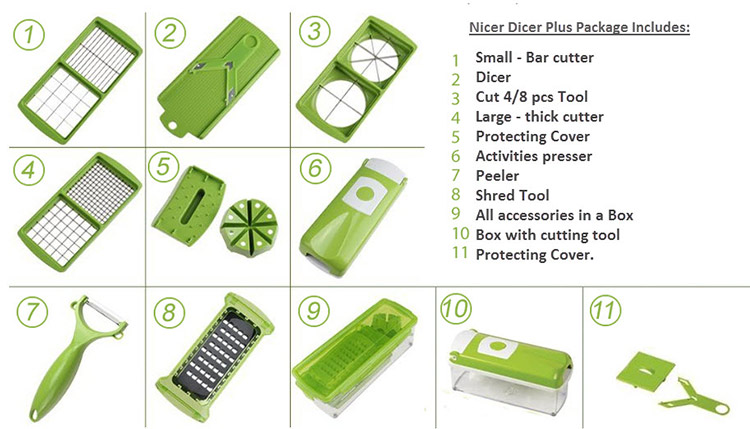 محتویات داخل جعبه خردکن نایسر دایسر پلاس Nicer Dicer Plus :