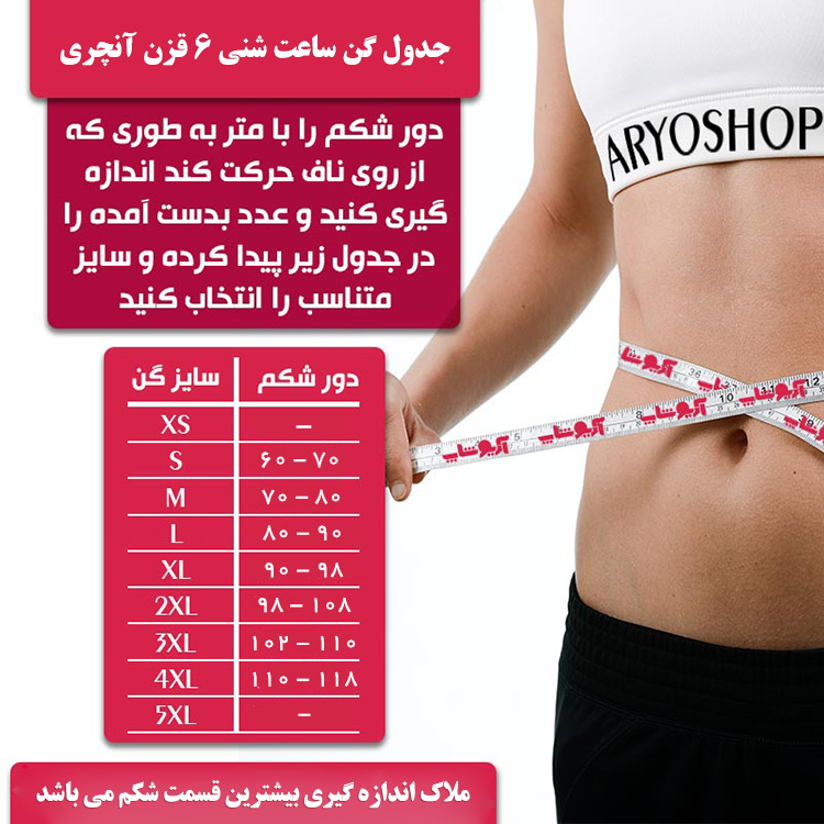 برای تعیین سایز گن ساعت شنی متناسب با اندام خود حتما اندازه بیشترین قسمت دور شکم خود را با سانتی متر اندازه گیری نمایید و در قسمت پیام از فرم ثبت سفارش درج کنید یا تلفنی به واحد فروش ما اطلاع بدهید و از نوشتن مواردی مانند سایز شلوار و مانتو و غیره خودداری نمایید